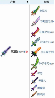使用泰拉刃+彩虹猫之刃+狂星之怒+波涌之刃+无头骑士剑+种子弯刀+星怒+养蜂人+附魔剑+铜短剑,合成一把天顶剑。