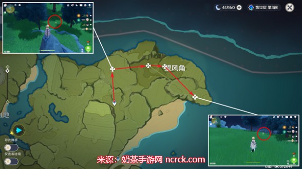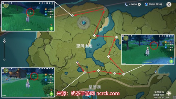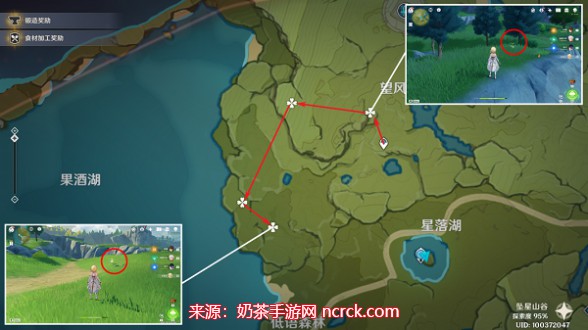 2、在望风山地的东侧,你可以按照以下顺序采集36个落落莓。沿着这条路线寻找采集点,你会发现这里的落落莓非常充足。