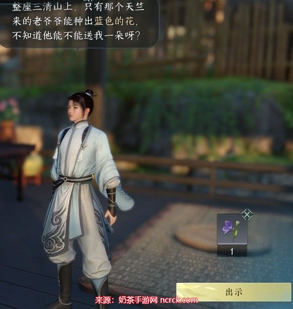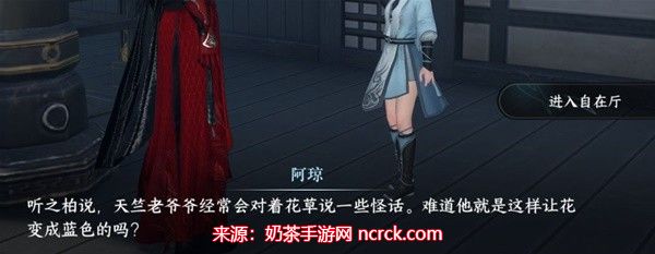 在自在亭门口,您会遇到一个名叫阿琼的NPC,他会提到天竺老爷爷能够将花变成蓝色。您需要前往找到天竺老爷爷。