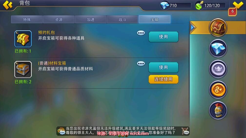 5、输入完激活码并确认后,回到游戏界面,点击背包图标,你就能在背包中找到激活码兑换的礼包了。