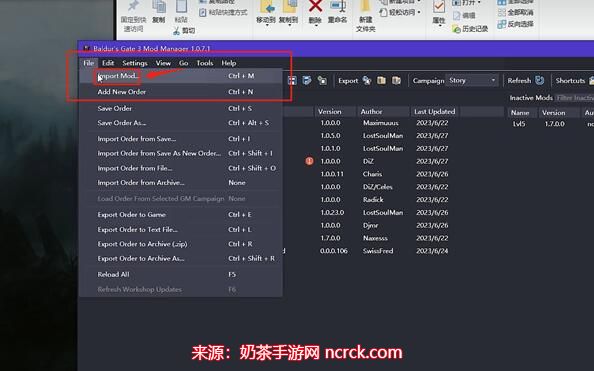打开刚刚下载好的MOD管理器,点击左上角的"File",选择"Import Mod"来添加MOD。