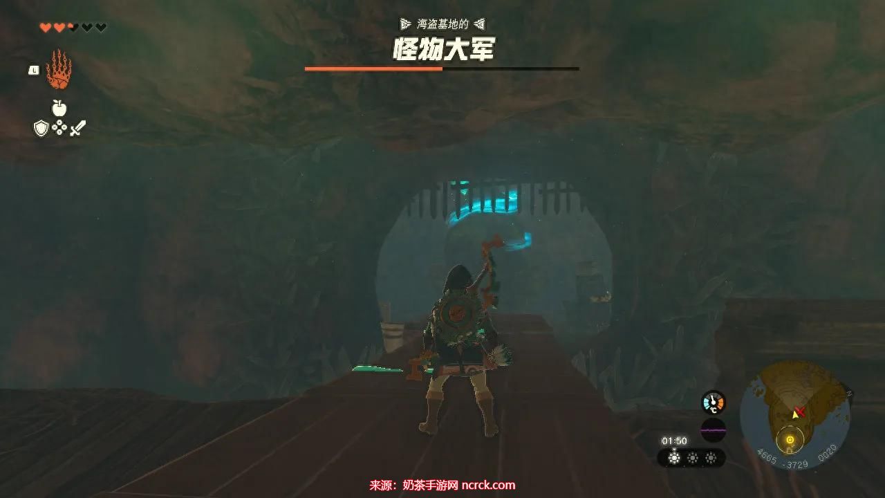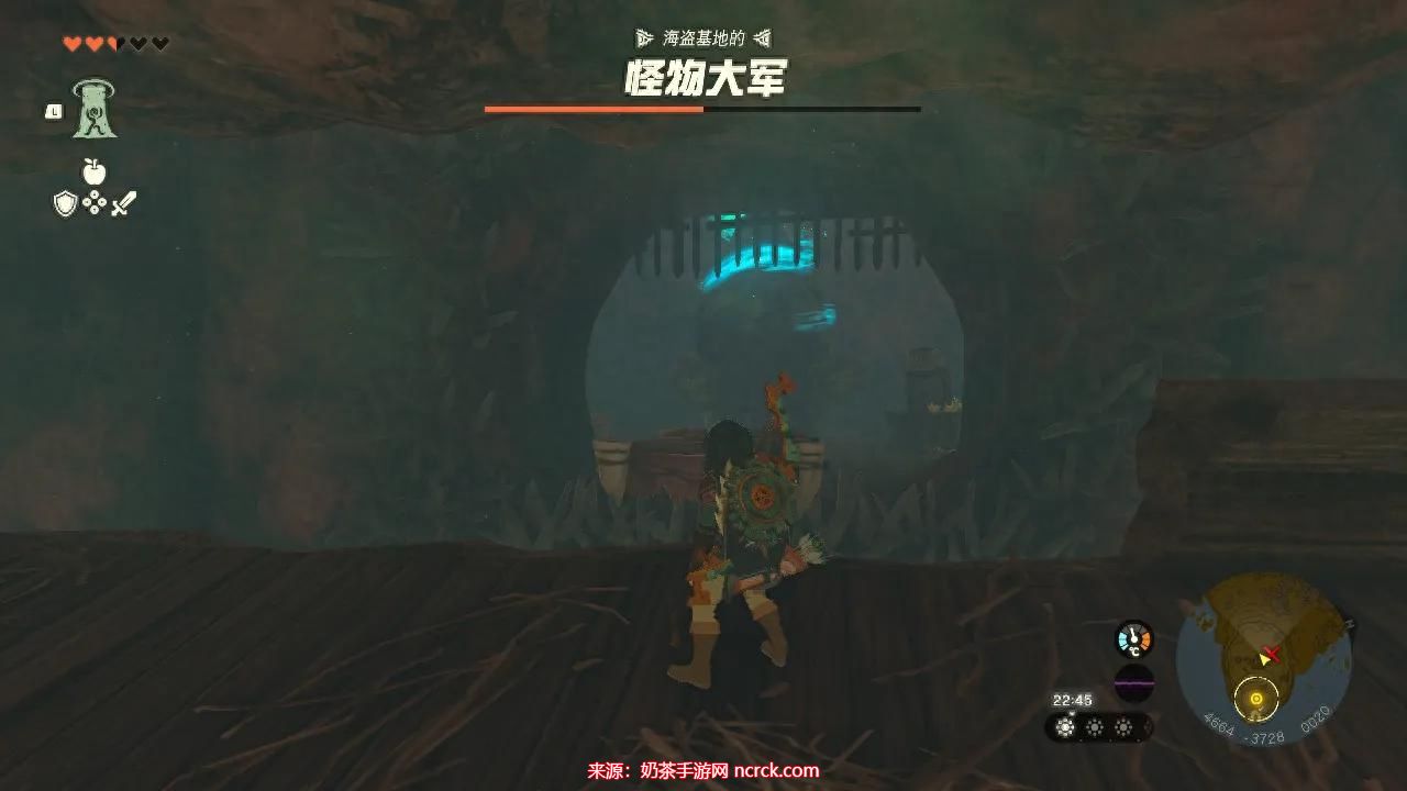 进入洞窟,内有海盗基地的怪物大军,在海盗船的船尾处可以看到神庙。
