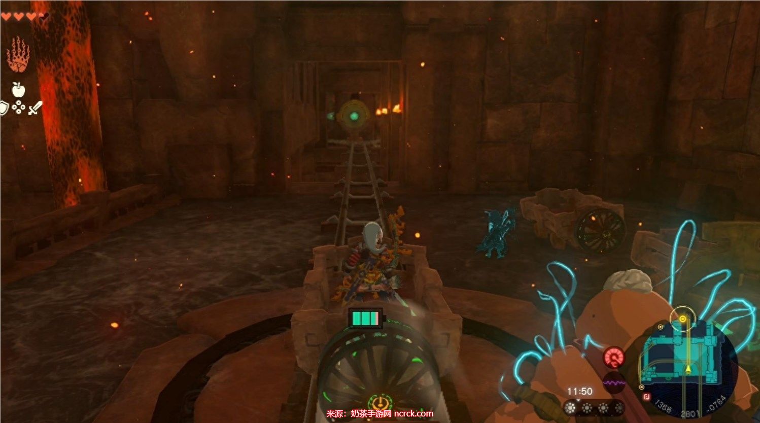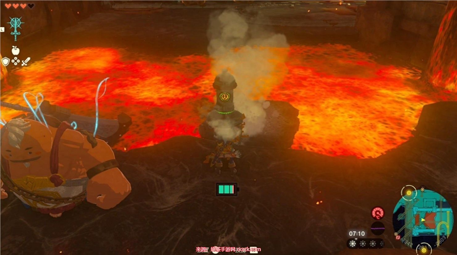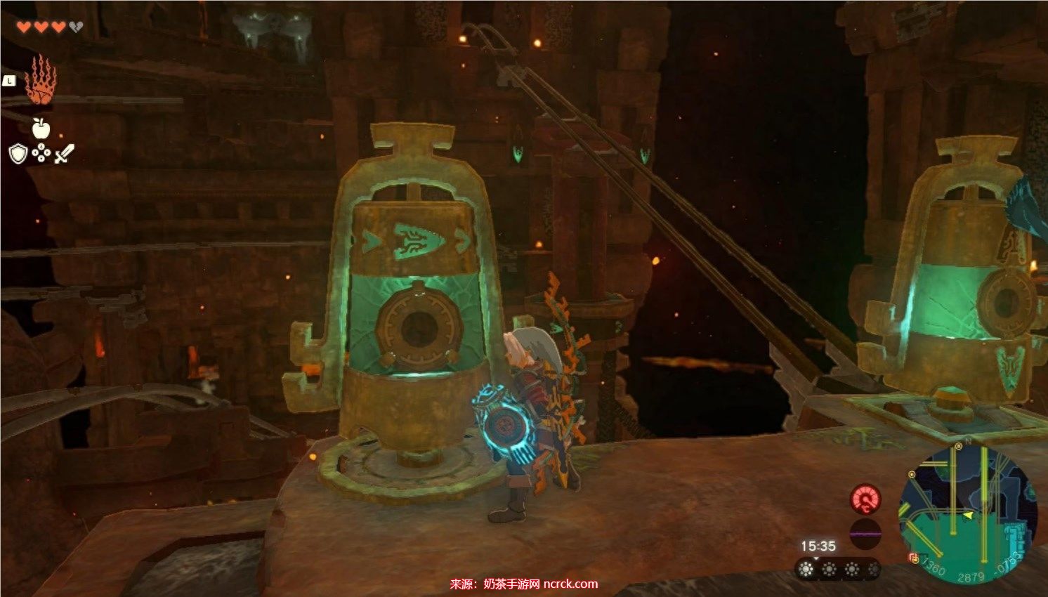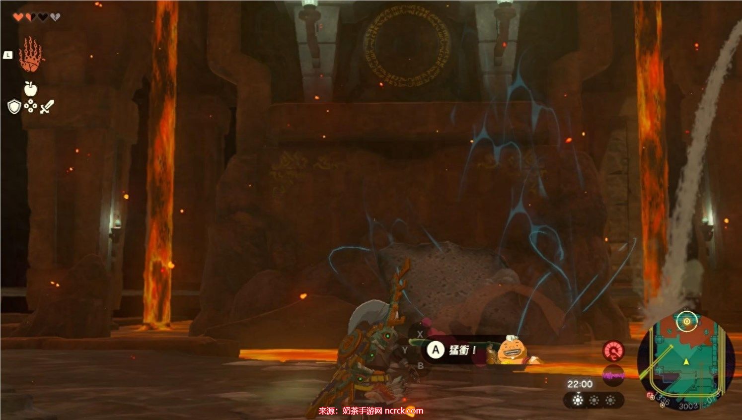 在轨道上行驶的过程中,阿沅会跑到矿车前方。你可以按A键将阿沅发射出去,然后使用A键操控阿沅撞击圆形装置,以改变铁轨的行进方向,这样才能到达下一个目的地。到达底部后,不要急着前进。下车,来到左边,携带一个放水栓,并朝深处前进,来到岩浆旁边。制作石头路并使用阿沅撞击挡路的石头,以继续前进。之后,走到底,你就能找到第一个铜锣了。铜锣也就是火之神庙的钥锁形式,用阿沅的能力撞击它并解锁,后面的步骤就不再赘述。