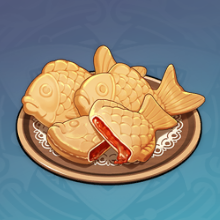 介绍:鲷鱼形状的点心。脆脆的外皮包裹着甜滋滋的内馅,深受稻妻人民喜爱。据说一开始只是普通的圆柱形,后来经过不断改良才逐渐变成了现在这般可爱的鱼形。
