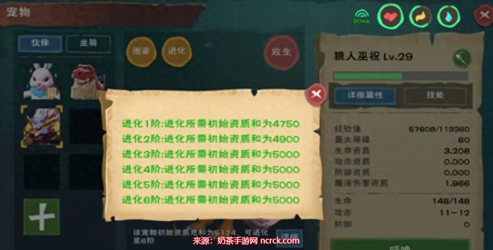 狼人是一个非常受欢迎的宠物类型,虽然合成公式较少,但却非常强大。首先,使用一只25级的狼和30级的狼合成狼人学徒,接着,将30级的学徒与40级的狼王融合,就能合成狼人侍从。然后,用35级的侍从与45级的沙漠狼融合,就能合成巫师,最后,用40级的巫师与50级的沙漠狼王融合,就能合成狼人巫祝。这些宠物都擅长法术攻击。具体的资质可参考下图。