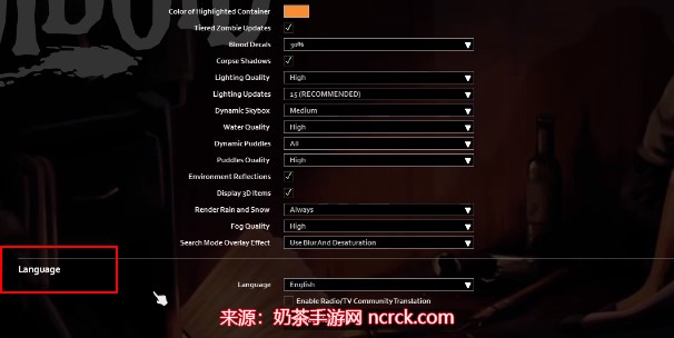 2、玩家们在进入Options页面之后,下滑到底部找到Language选项;