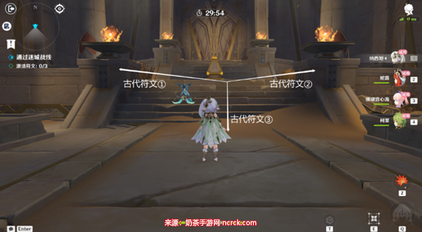 4、玩家在进入挑战之后需要前往3个不同的方向去把古代符文给激活。