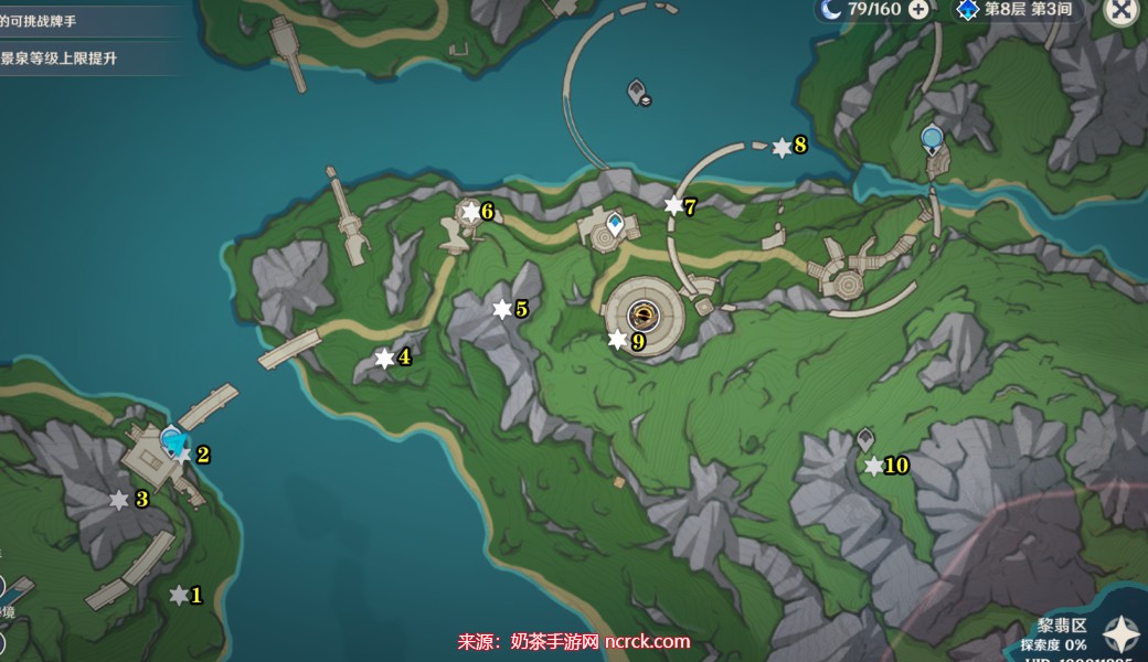 我们可以先从左侧位置开始进行收集,这样的话正好按照顺序来进行的,最后我们前往靠下方的水神瞳即可。